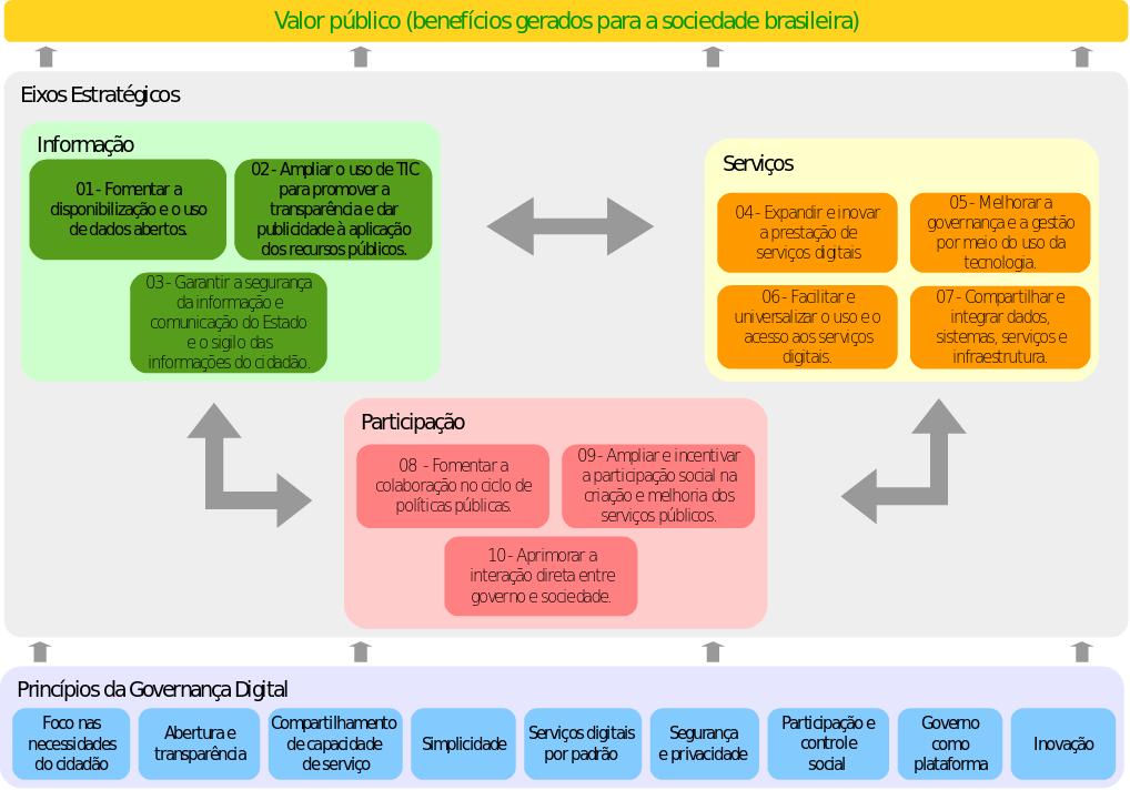 | Serviços | 04 - Expandir e inovar a prestação de serviços digitais. 05 - Melhorar a governança e a gestão por meio do uso da tecnologia. 06 - Facilitar e universalizar o uso e o acesso aos serviços digitais. 07 - Compartilhar e integrar dados, sistemas, serviços e infraestrutura. |